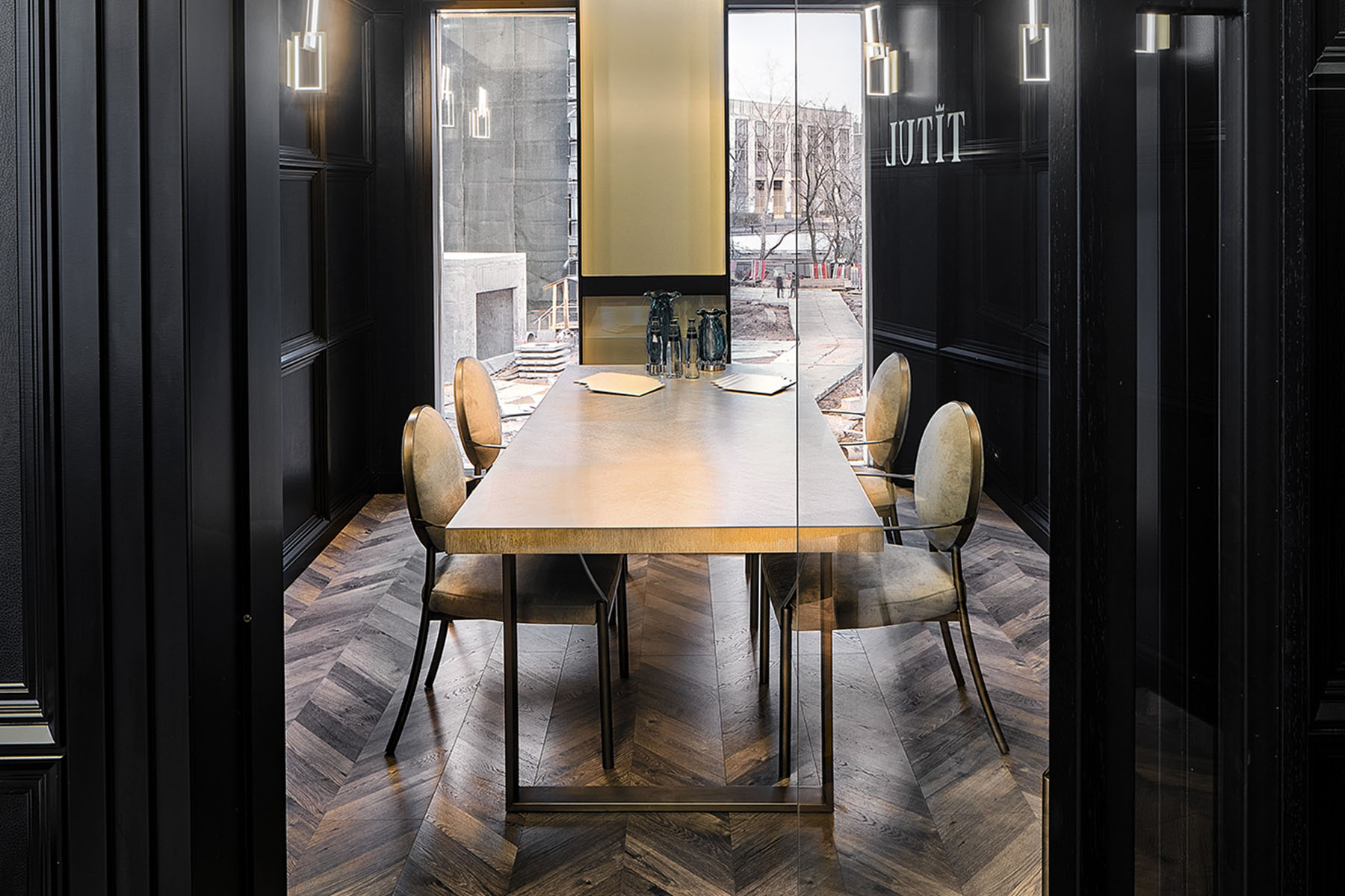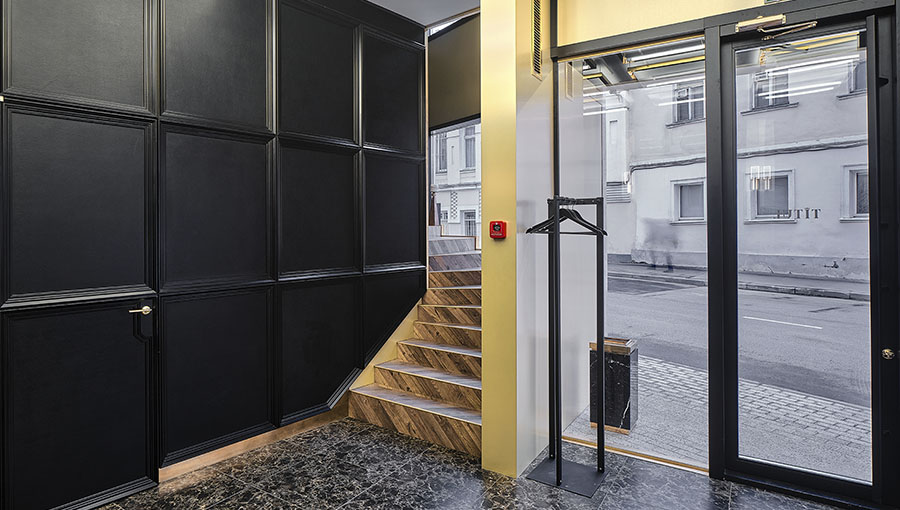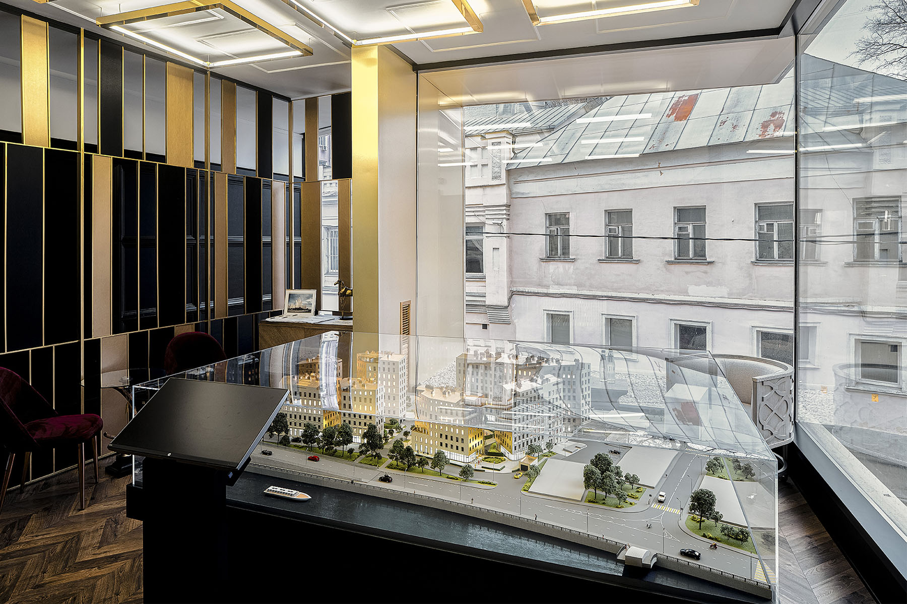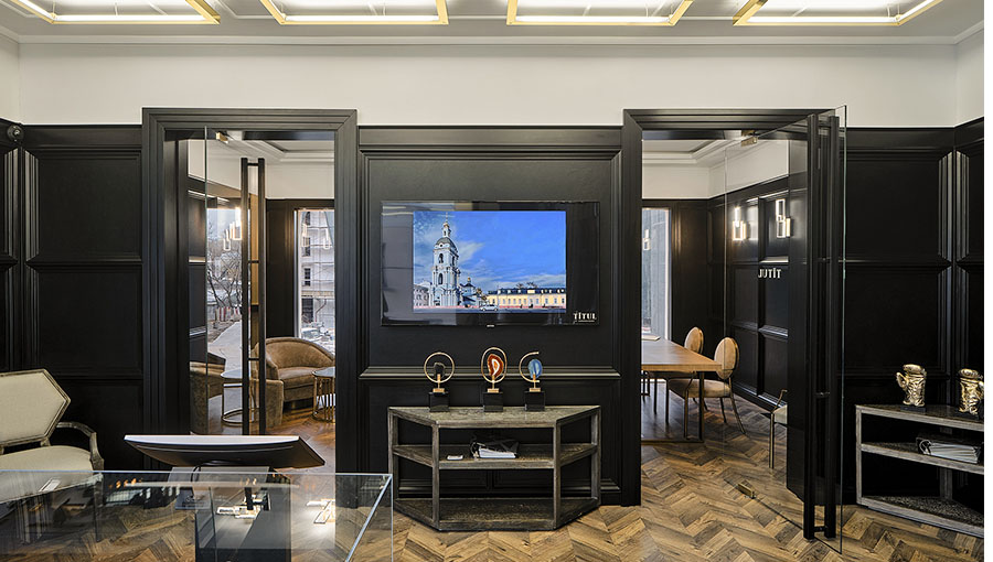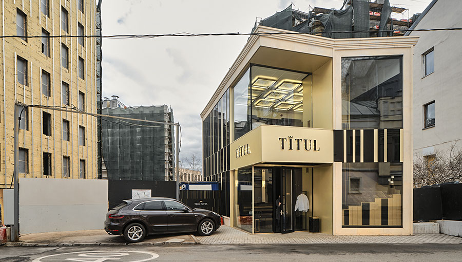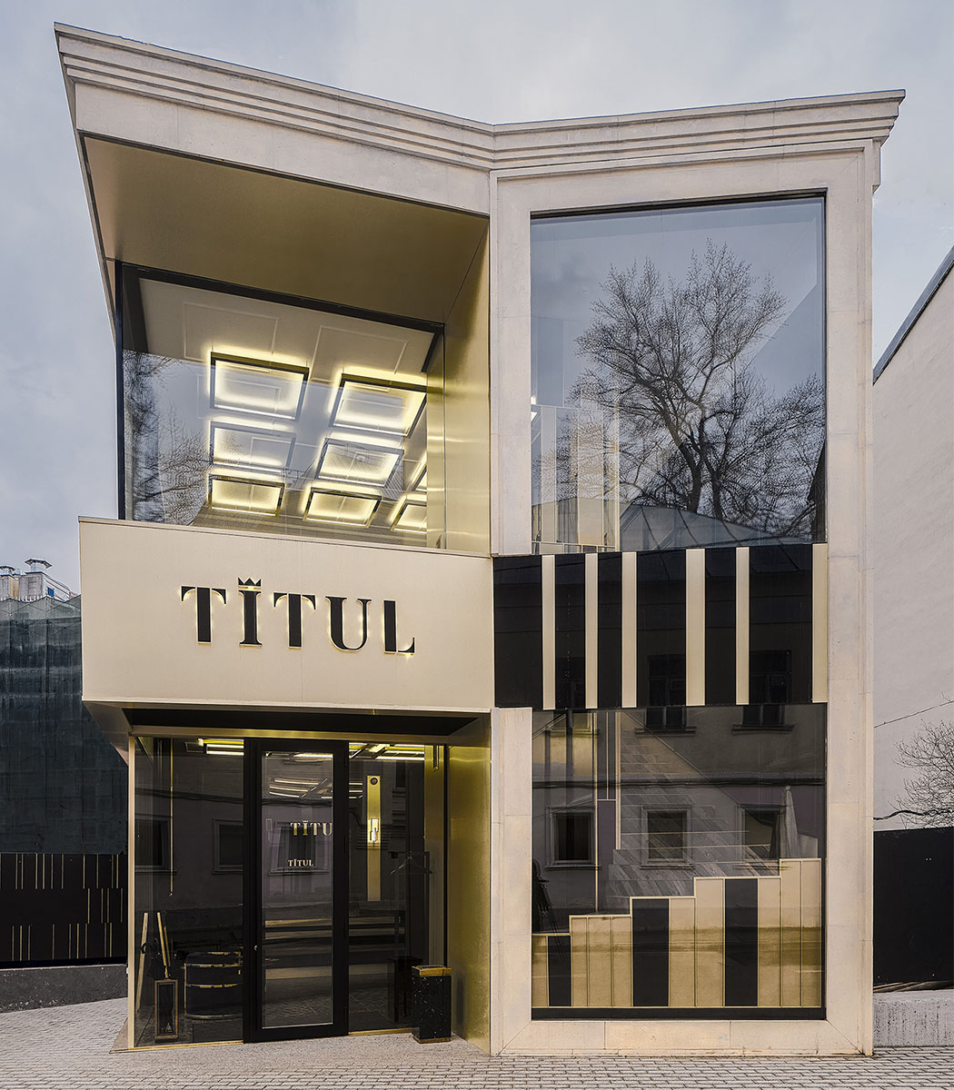 Для офиса продаж ЖК "Титул", строящегося на Серебрянической набережной, было выделено крайне малое пятно - 6 на 11.5 метров, неправильной пятиугольной формы, с трех сторон, кроме лицевой, пятно застройки было зажато корридорами сетей, которые предстояло проложить заново - отчасти по этой причине здание офиса продаж достаточно скромное по площади - около 140 кв. м., и к тому же обладает столь необычной формой/конфигурацией фасада.