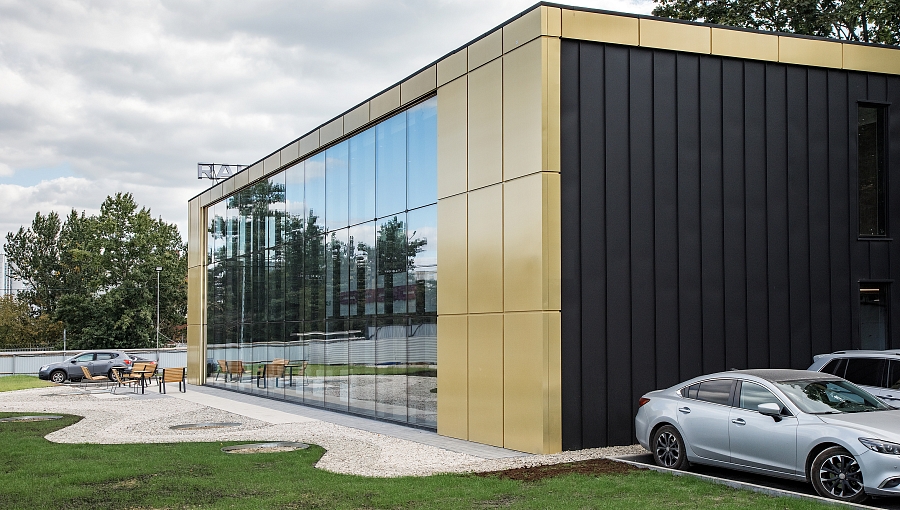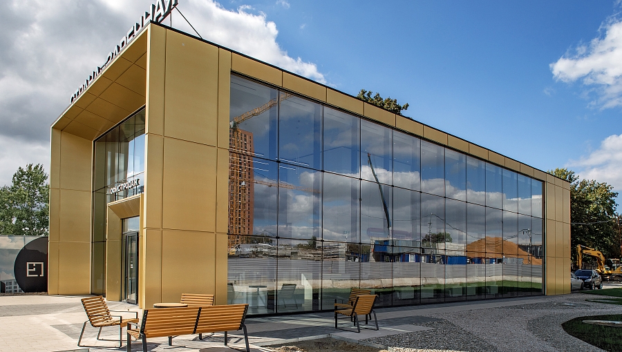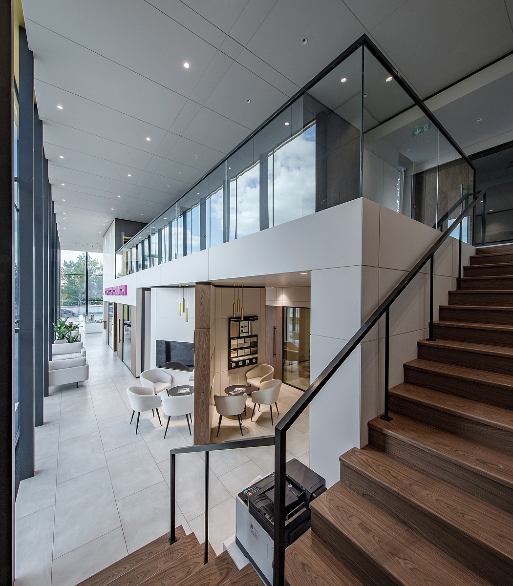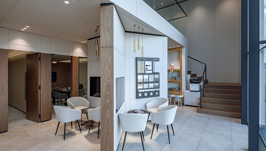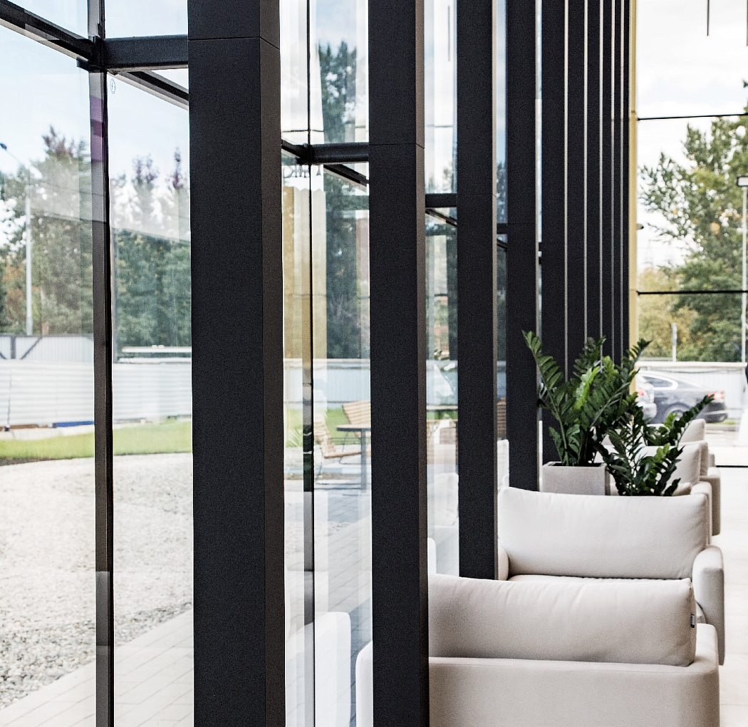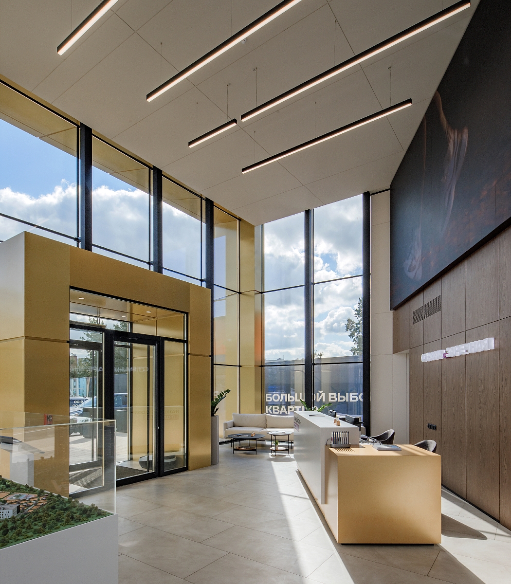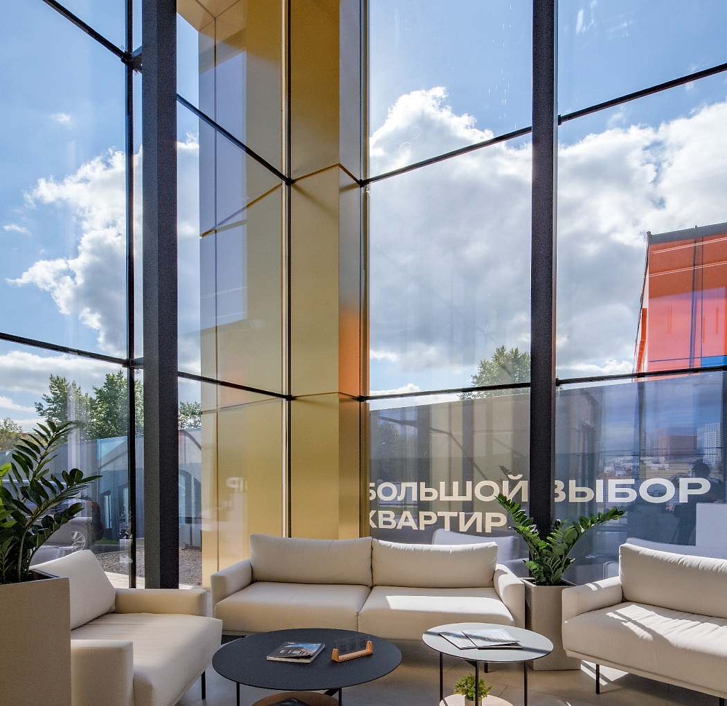 Высокие потолки и панорамные окна зоны ресепшен создают ощущение большого пространства и обилия естественного света.