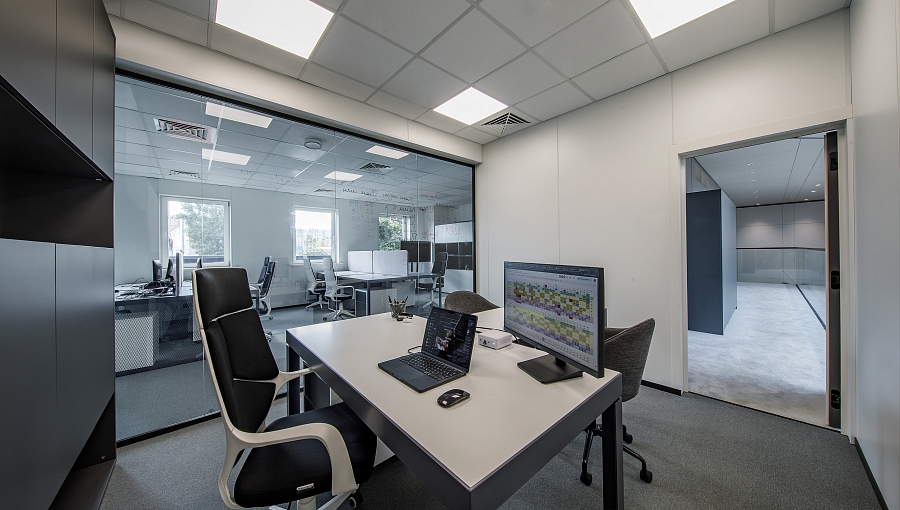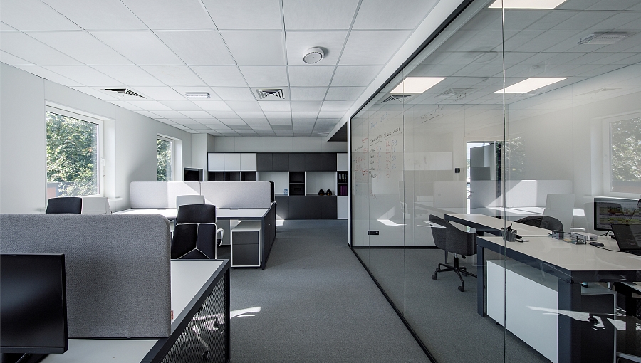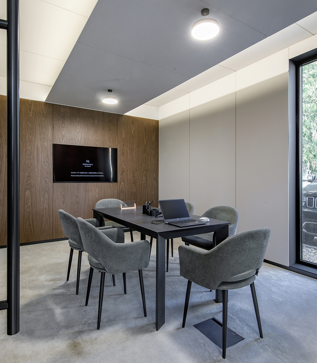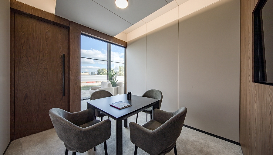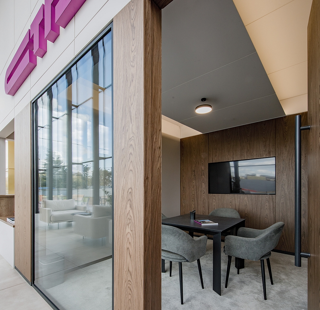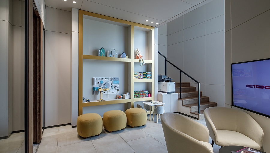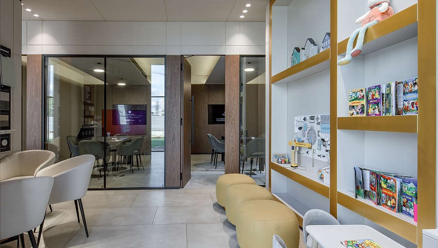 В интерьере можно выделить несколько зон: входная зона, зона ресепшн и зона ожидания с диванами и журнальным столиком. В зоне переговорных расположена детская зона.